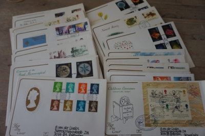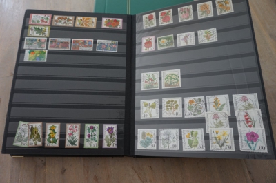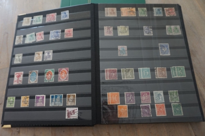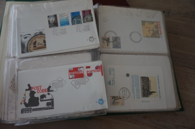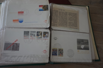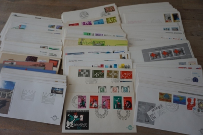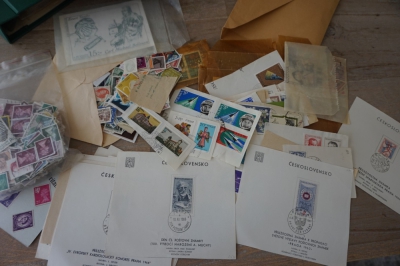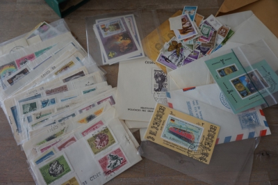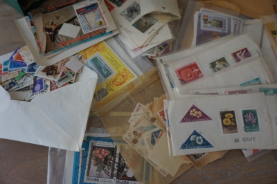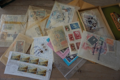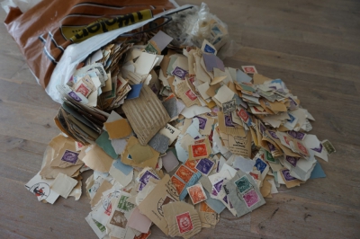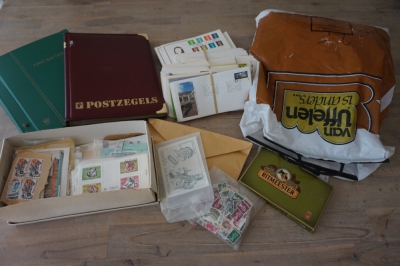 Een doos met postzegelrestanten waarbij FDC's, een zak onafgeweekte zegels, postzegels in zakjes, en meer.