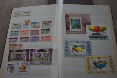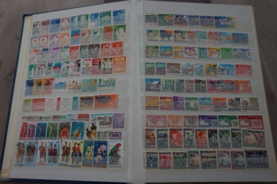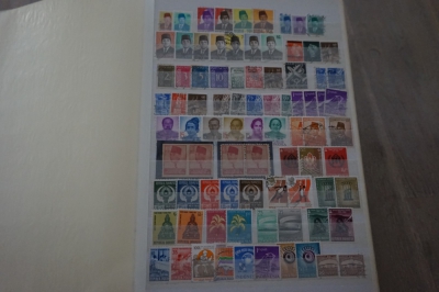 Dik insteekboek met verzameling postzegels Indonesiƫ, Nederlandse gebieden en iets divers.