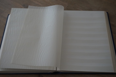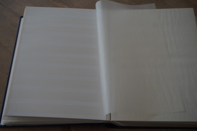 Dik insteekboek, 24 bladen = 48 pag. met dubbele schutbladen en donkerblauwe band in vrijwel nieuwstaat.