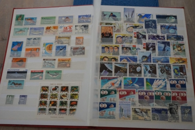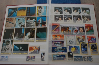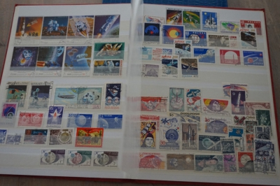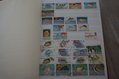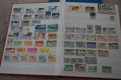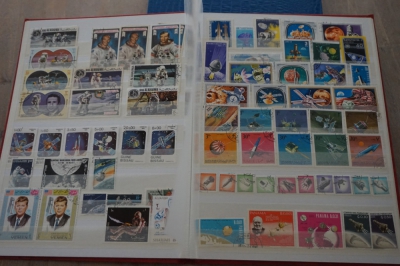 Motief o.a. vissen en ruimtevaart verzameling postzegels in album