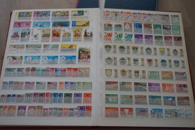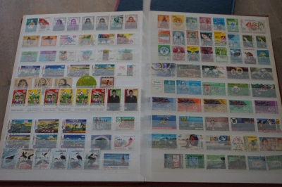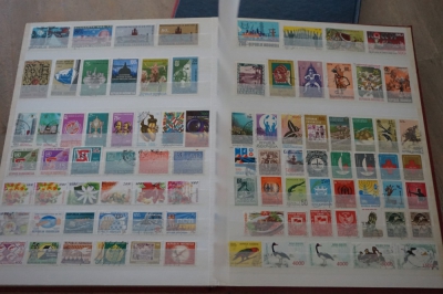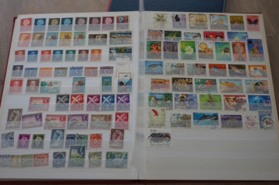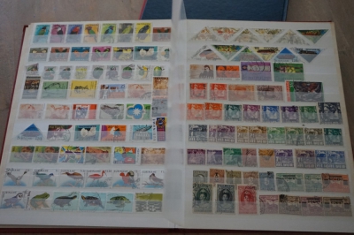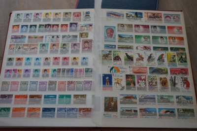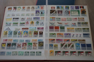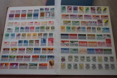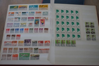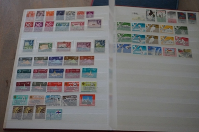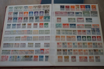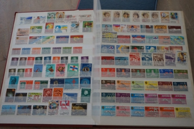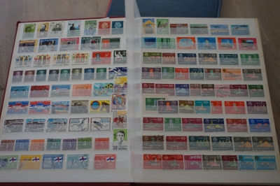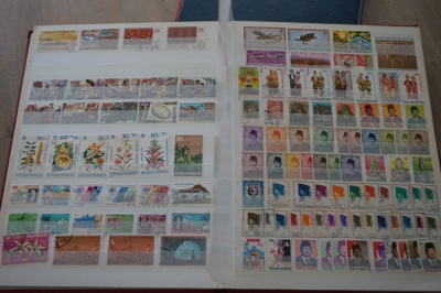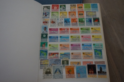 Insteekboek met verzameling postzegels Nederlandse gebieden en Indonesiƫ.