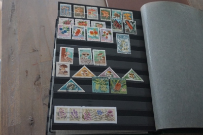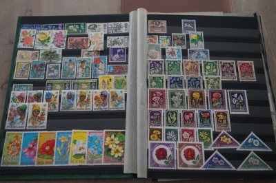 Losliggend insteekboek met verzameling postzegels motief bloemen.