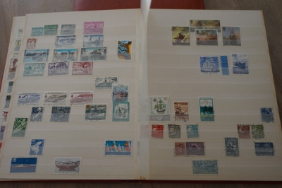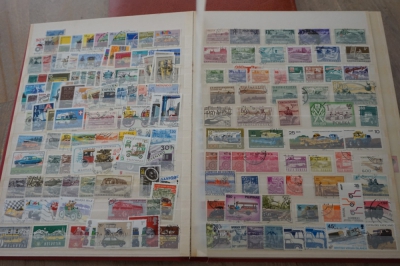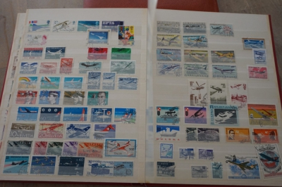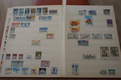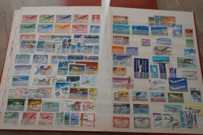Insteekboek met verzameling postzegels motief vervoermiddelen.