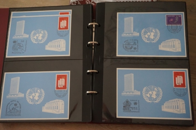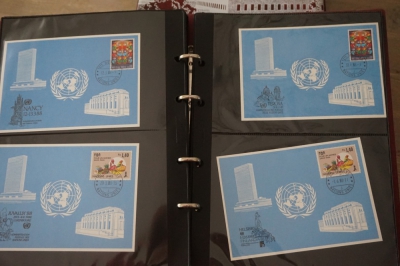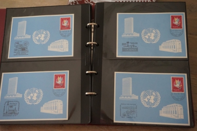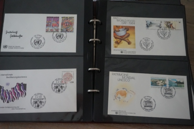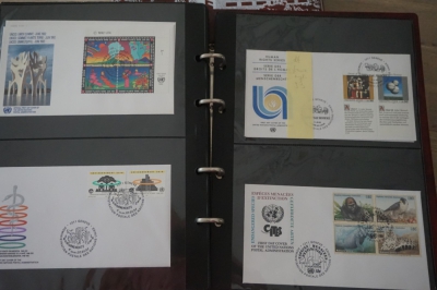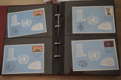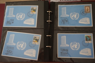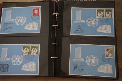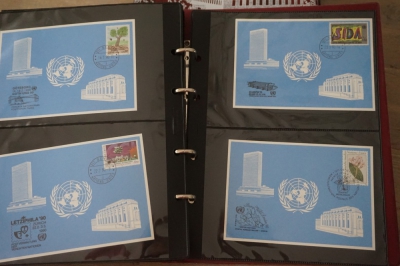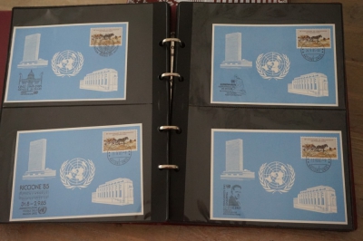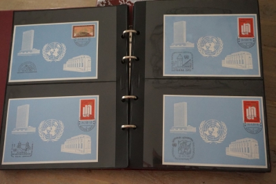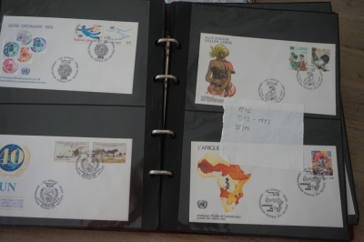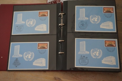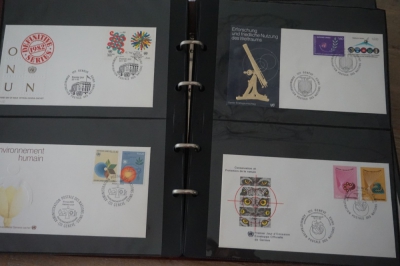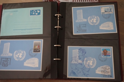 3 Albums met verzameling postzegels, beurskaarten en FDC's e.d. VN Geneve.