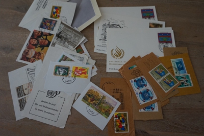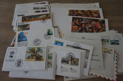 Verzameling ong. 100 brieven en meest FDC's VN Wenen plus diverse briefstukjes met postzegels.