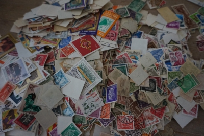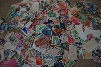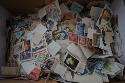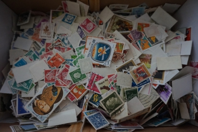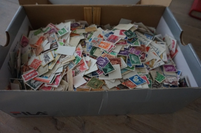 Uitzoekdoos met duizenden afgeweekte postzegels divers.